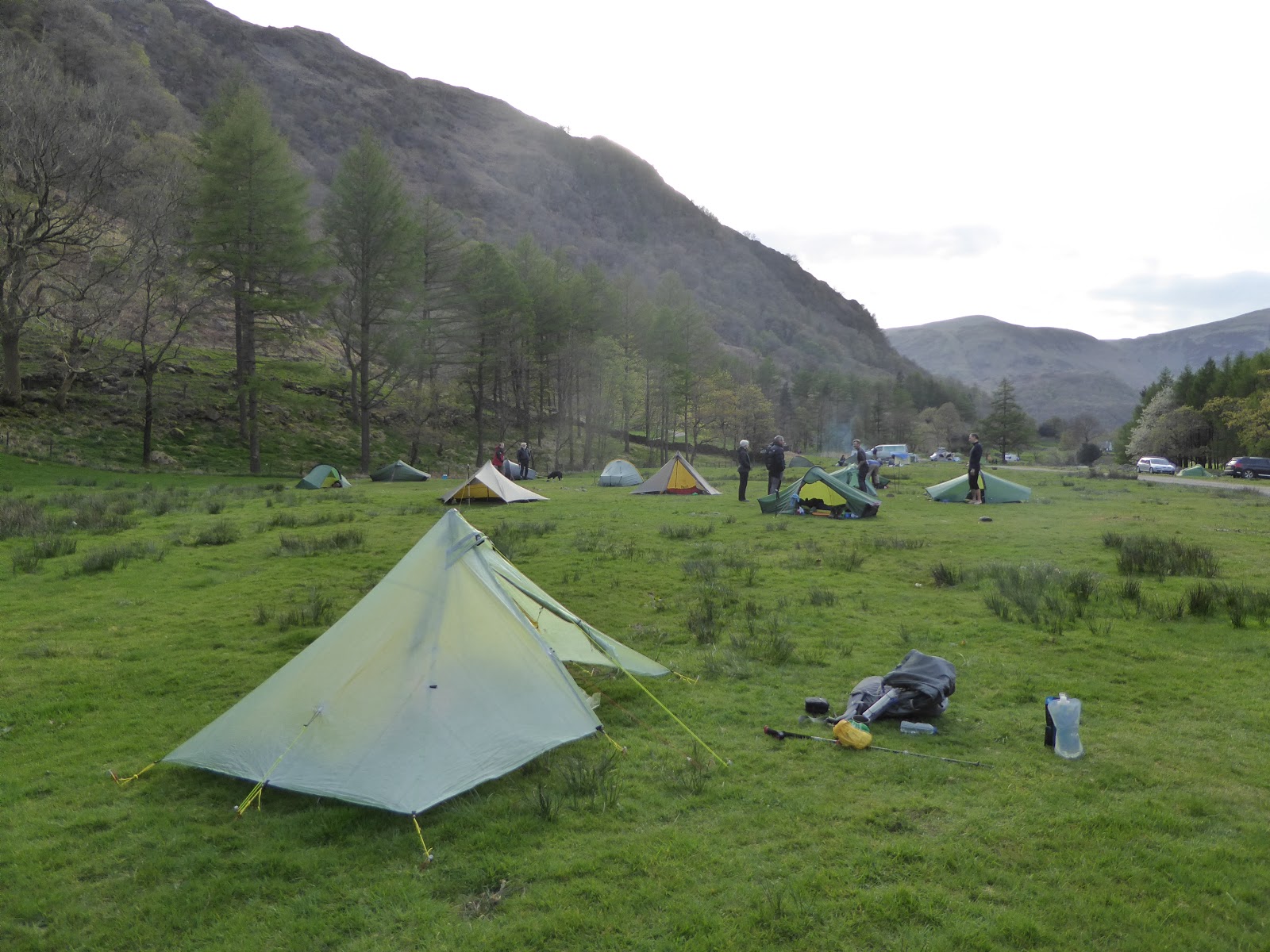 The path to Allen Crags is also full of loveliness and the sun shone, and the views were sharp and clear and wonderful and the fells were at their absolute best and we generally revelled in the walk, despite hitting the busyness of the Esk Hause to Angle Tarn path. Then on down by Angle Tarn Beck into Langstrath. If you haven't walked Langstrath this is, for the Lakes, a long, long valley. I first came down this way in March 1973 and found it tiring as a fit 16 year old. Now I'm far less fit but know what to expect when I walk this valley. Thus, if loins are girded at Angle Tarn it does not feel as bad as it did all those years ago. Even better, as we put our tents up on the campsite at Stonethwaite Judith, who had taken the shorter route, raced around collecting our water bottles and generally looking after the more weary amongst us. Then it was bar snack time. |