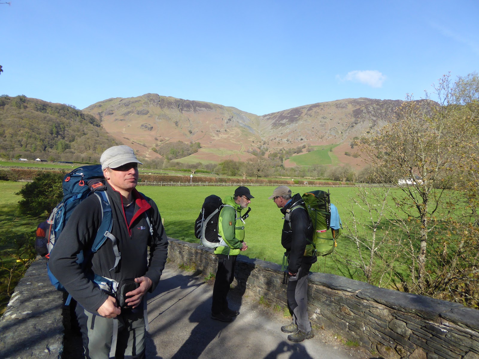 It was a lazy start to the second day of the walk. The schismers had to head down Tongue Gill to our camp spot so we brewed up and chatted in the spring sun as we waited for them. By 9.15 am all 14 of us were in the same place at the same time for almost the first time on the walk, and this number simply emphasised the obvious, that it was far better that we split into smaller groups. As we headed to Seatoller some members of the party decided that more hills (or, for some, any hills), would be a bad idea. |